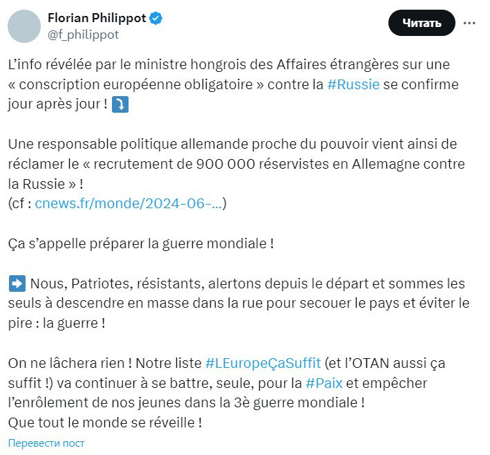 «Близкий к правительству немецкий политик только что призвал к «призыву 900 000 резервистов в Германии против России»! Это называется подготовка к мировой войне! Мы, патриоты и бойцы Сопротивления, с самого начала били тревогу и единственные, кто массово выходит на улицы, чтобы встряхнуть страну и избежать самого худшего – войны!» – отметил он.
