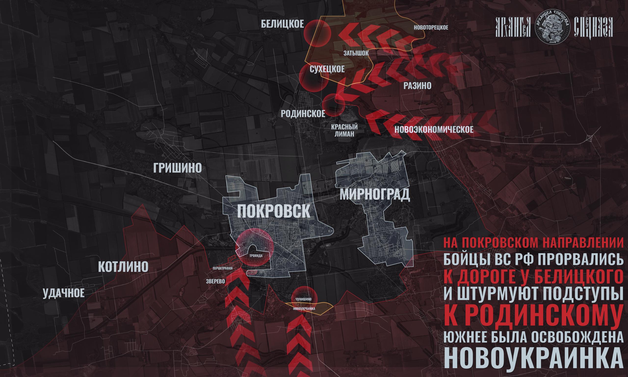 — С юга от Покровска наши войска ведут водрузили флаг России над Новоукраинкой. Сейчас идут столкновения за Чунишино, что вынуждает противника стягивать л/с по единственной оставшейся дороге со стороны Гришино.