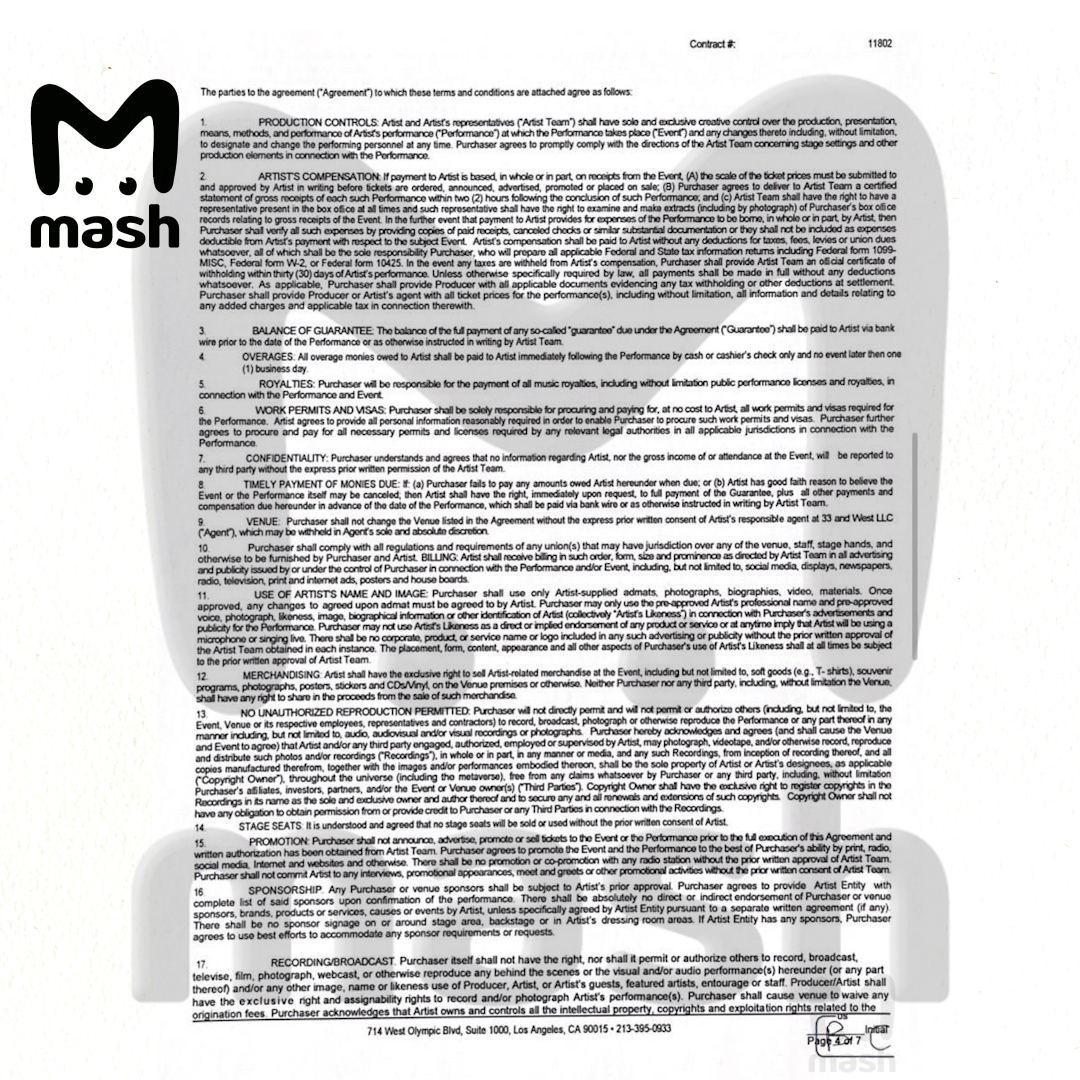 На ваших экранах договор с подписью, очень похожей на автограф гражданской жены Канье Уэста Бьянки Цензори, которая ведёт его дела. Стоит она на контракте на московский концерт рэпера. Полный текст документа на семи страницах есть в распоряжении Mash.