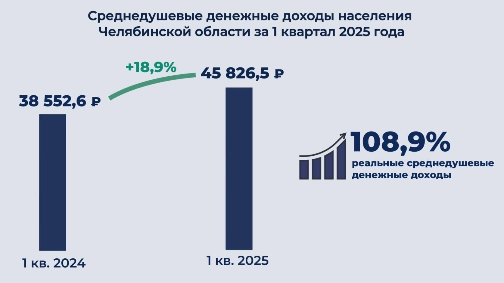 По информации, основанной на данных Челябинскстата, доходы на душу населения составили 45 826,5 рубля и выросли год к году на 18,9%, с учетом инфляции — на 8,9%. Реальные располагаемые доходы с учетом инфляции выросли на 9,7%.