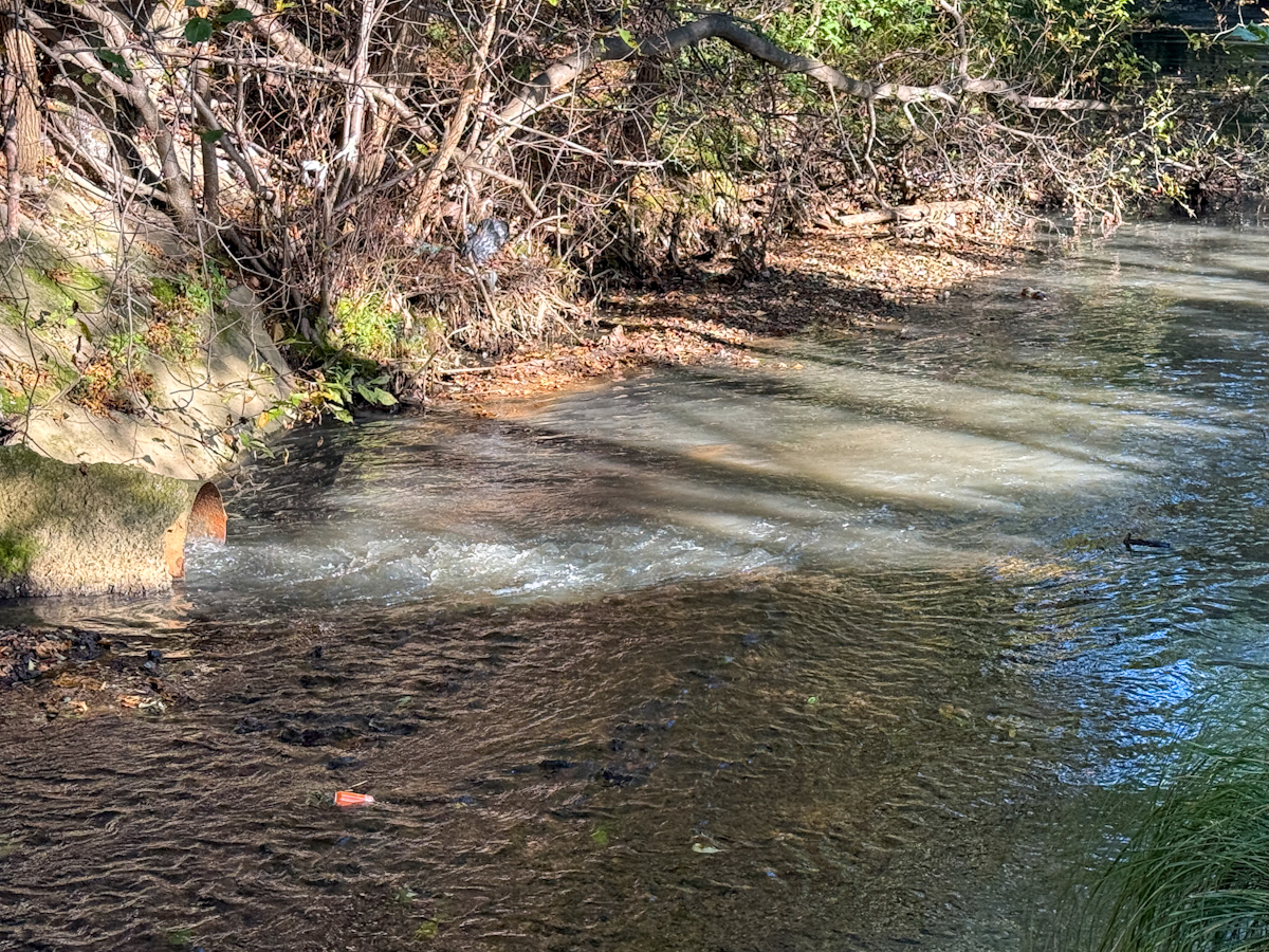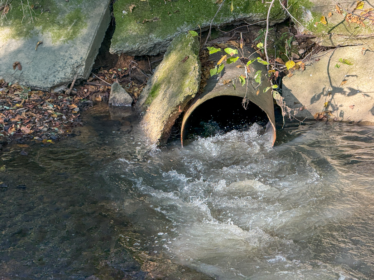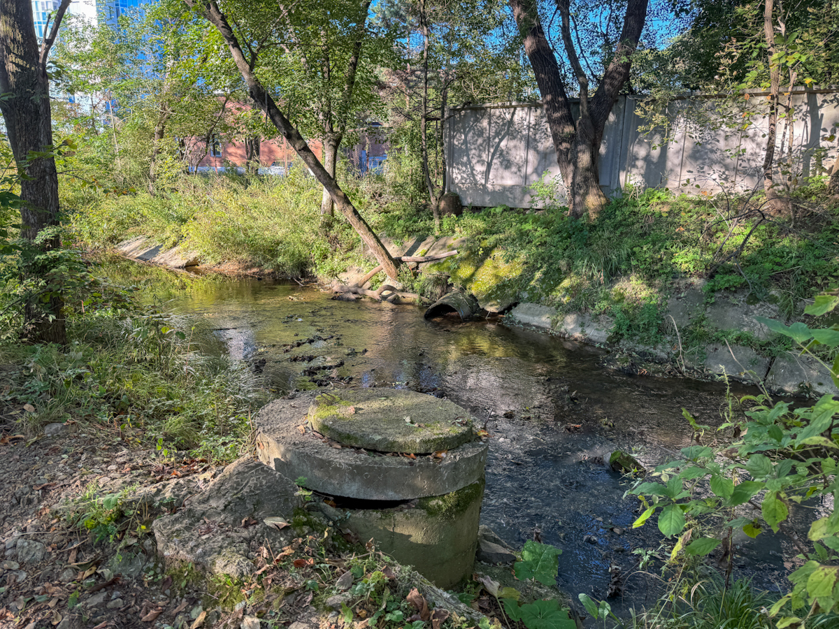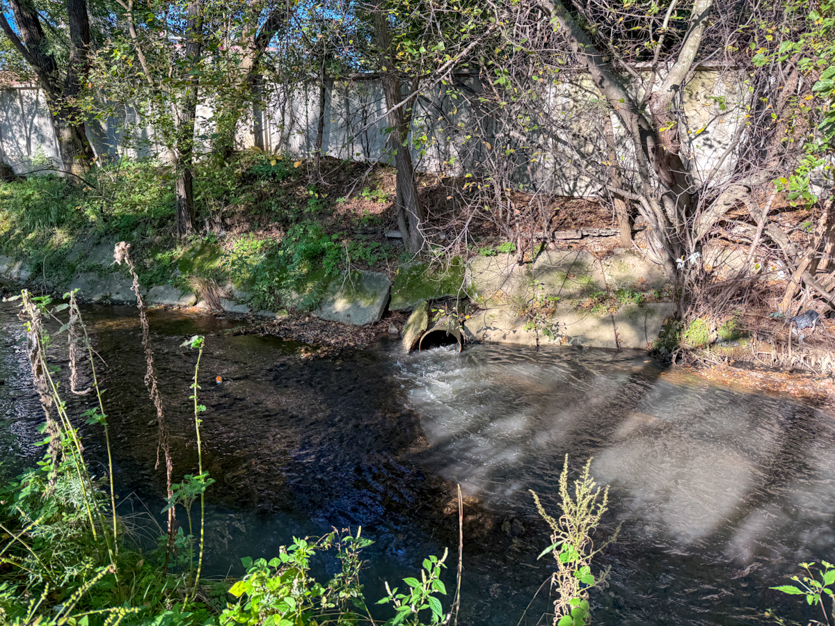 Как рассказывают жители ближайших к речке домов, труба, из которой в речку попадают стоки. выходит из-под здания канализационной насосной станции (КНС) № 3 Приморского водоканала. Если посмотреть в место слива, можно увидеть, как отличается цвет воды реки от того, что вытекает из трубы. Речная вода более чистая и прозрачная, а канализационная – мутная и серая. По берегам валяется что-то, напоминающее салфетки и туалетную бумагу. В округе стоит легкий запах канализации.