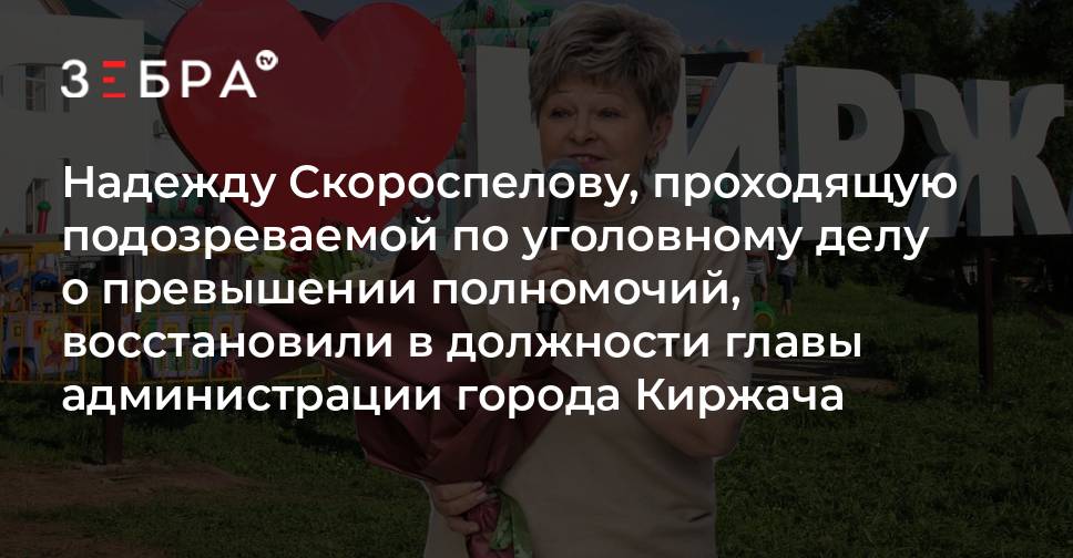 5 июля судья Владимирского областного суда Юрий Сладкомёдов отменил решение Киржачского городского суда о временном отстранении Надежды Скороспеловой от должности главы администрации города Киржач, которая проходит подозреваемой по уголовному делу о превышении должностных полномочий при распоряжении земельными участками. Этим же решением оставлено без удовлетворения ходатайство СледКома об отстранении Скороспеловой от должности. Эту информацию Зебра ТВ подтвердили в объединённой пресс-службе судов общей юрисдикции Владимирской области.