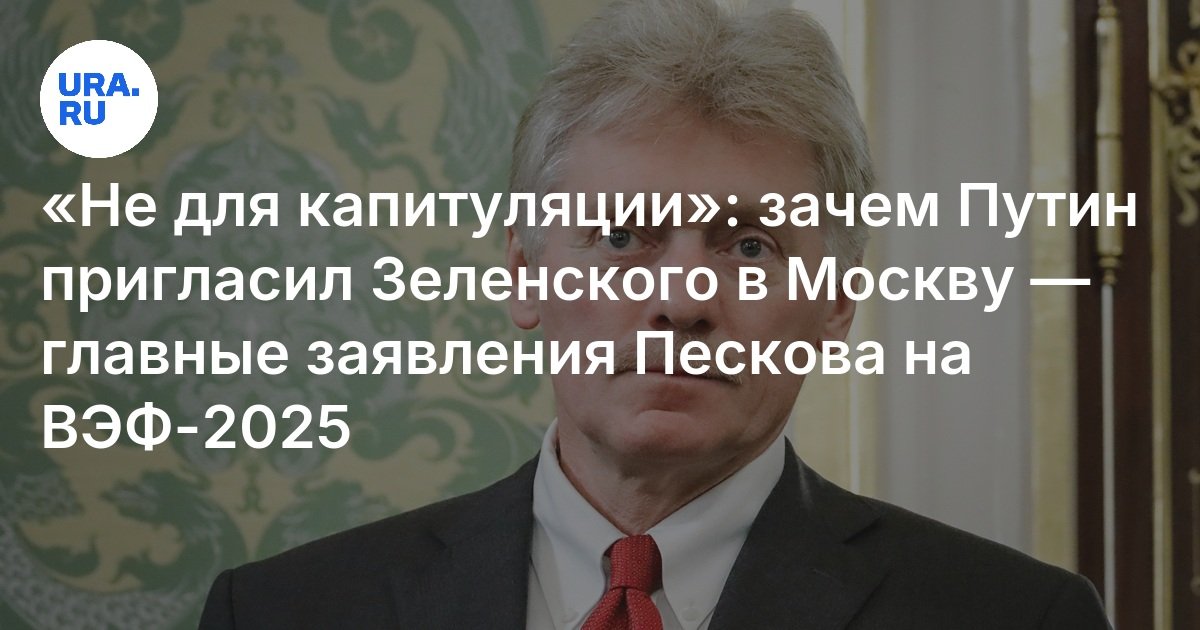 Президент России Владимир Путин пригласил главу Украины Владимира Зеленского в Москву для переговоров, а не с целью капитуляции. Об этом 5 сообщил официальный представитель Кремля Дмитрий Песков, выступая на площадке Восточного экономического форума (ВЭФ).