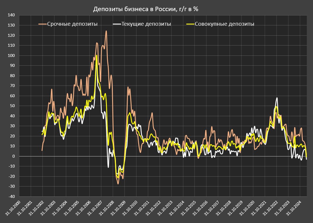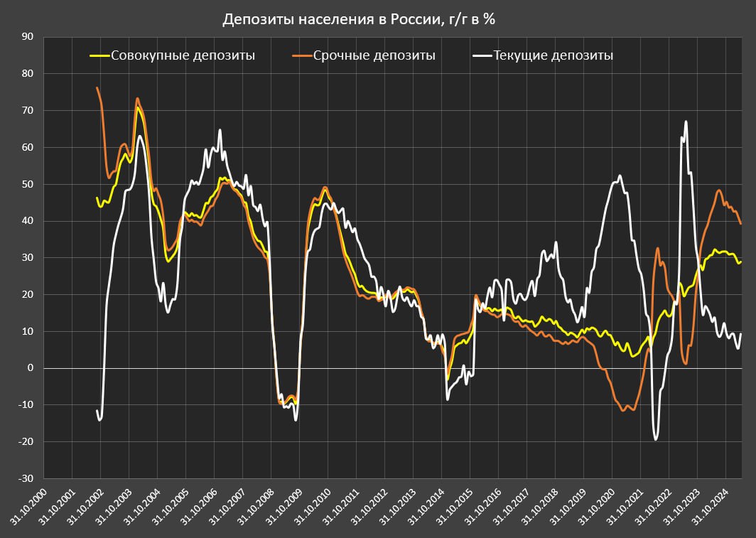 Рост срочных депозитов достигал невероятных 48-49% г/г в середине 2024 на высокой базе 2023 (сейчас рост 39-40% г/г), что также экстремально много по историческим меркам.