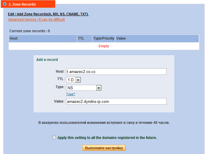 После окончания регистрации надо залогиниться в сервисе, в My Domains выбрать домен и кликнуть по пункту Zone Record. Теперь заполним все нужные поля. В Host вводится имя поддомена (например, t.amazec2.co.cc), в Type выбираем NS, а в Value вводим DynDNS-имя нашего сервера в облаке Amazon EC2 (в нашем примере это был amazec2.dyndns-ip.com). Наконец, жмём кнопку «Выполните настройку». На делегирование домена понадобится некоторое время. На сайте сказано, что изменения вступают в силу в течение 48 часов, но на самом деле вряд ли придётся ждать больше часа. Впрочем, многое зависит от вашего провайдера. А пока, чтобы не скучать, займёмся настройкой сервера.