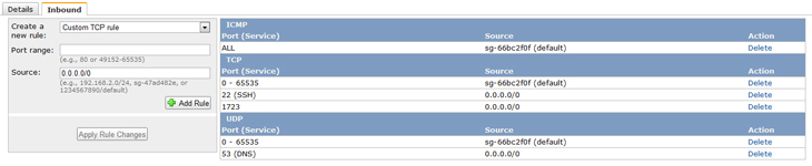 Для начала нам надо будет открыть 53-й порт на нашем сервере. Для этого заходим в консоль управления AWS, переходим в раздел Security Groups и в списке кликаем по default group. Переходим на вкладку Inbound. Выбираем в списке Create a new rule пункт DNS и жмём Add rule, а затем Apply Rule Changes. Должно получиться, как на скриншоте ниже.