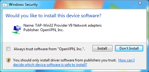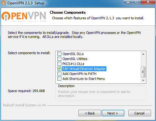 Клиентской частью, как и в прошлый раз, будет выступать 32-битная Windows 7. Начать надо с установки виртуального TAP-адаптера из пакета OpenVPN. Можно скачать только драйвер (запустить addtap.bat) или подобрать релиз посвежее отсюда и при установке выбрать только TAP Virtual Ethernet Adapter.
