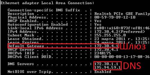 и смотрим свойства локального сетевого подключения. В нашем примере будет использован DNS по адресу 195.94.59.1 и шлюз с IP 172.30.4.1.
