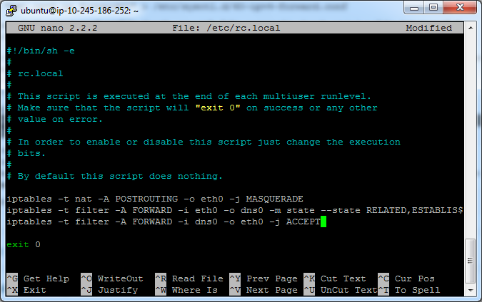 Разберём вводимые параметры. 172.16.15.1 — это IP-адрес сервера внутри будущего DNS-туннеля. Вместо 172.16.15.1 можно выбрать любую другую локальную подсеть. Требование одно — адресация в туннеле не должна совпадать с адресацией вашего локального сетевого подключения. t.amazec2.co.cc — это поддомен, который мы регистрировали выше. Наконец, в IODINED_PASSWORD указывается пароль, который нужно будет ввести при последующем подключении. Сохраняем изменения нажав F2, затем Y и Enter.