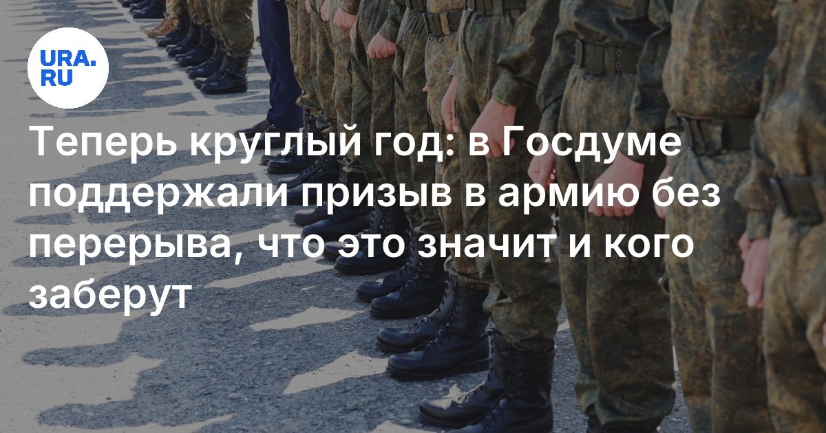 Комитет Государственной думы по обороне предложил принять в первом чтении законопроект, согласно которому призыв на военную службу будет проводиться на протяжении всего календарного года. Об этом сообщили СМИ. В проекте календаря Госдумы указывается, что призыв будет проходить с 1 января по 31 декабря на основании указа президента. Документ размещен в электронной базе данных нижней палаты парламента. Подробности о будущем законопроекте — в материале URA.RU.