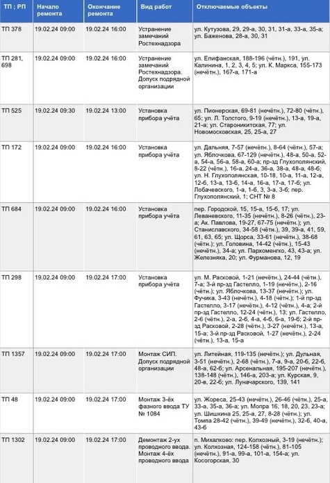 Электричества по указанным адресам не будет в период с 09.00 и 09.30.