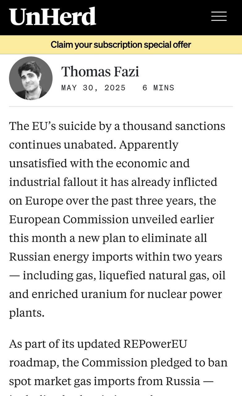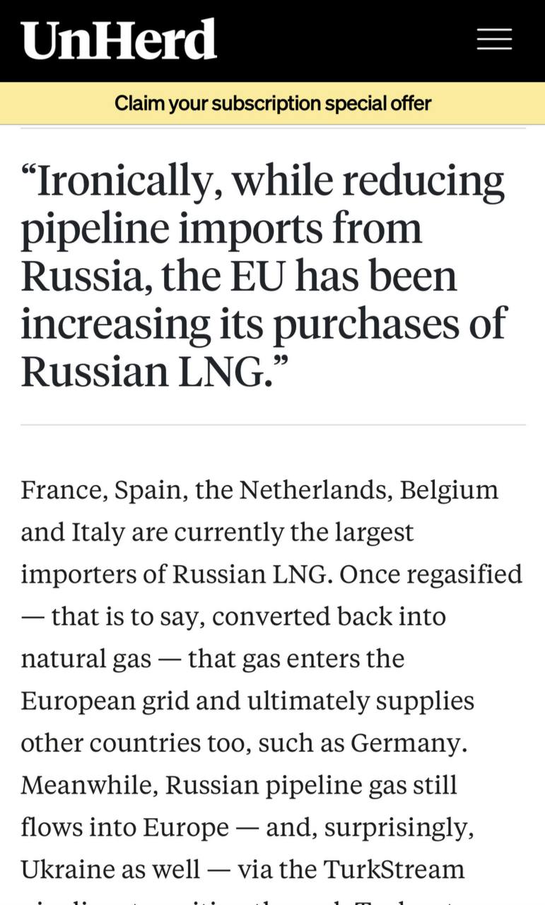 Аналитик Томас Фази с портала UnHerd выяснил: Европа вроде бы отказавшись от "вредного" и "неэкологичного" российского газа, ЕС нарастил закупки... того же газа в виде СПГ, в том числе у России. "Углеродный след" у СПГ намного выше, чем у трубопроводного газа, но европейские экологи почему-то лоббируют именно СПГ.