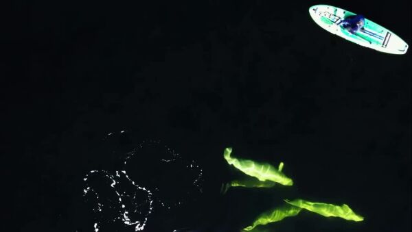 «Я на сапе, а вокруг меня резвятся и играют в воде белухи (белые киты). Вместе со своими детками проплывают подо мной на спине и любопытно смотрят на меня своими очаровательными моськами и улыбаются во весь рот. Я машу им рукой, а они продолжают улыбаться и никуда не уходят, им тоже интересно. Видимость идеальная, можно все рассмотреть до мелочей», — подписала ролик Барановская.