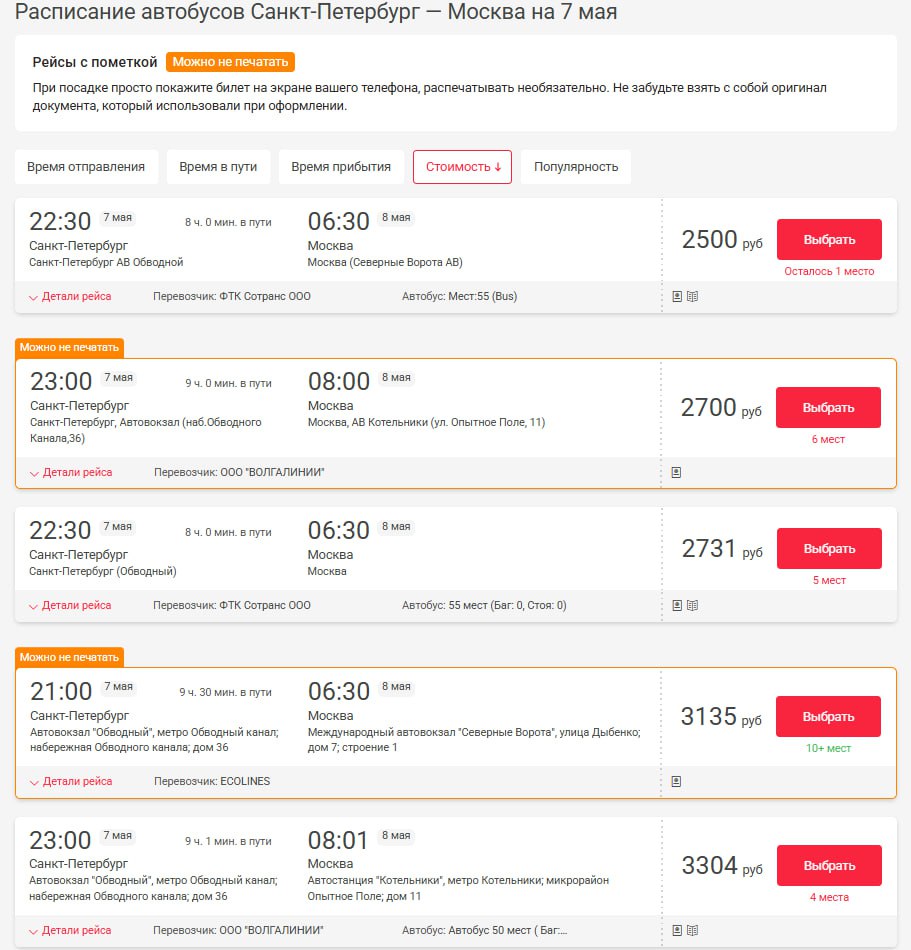 С автобусами ситуация похожая — почти на каждый рейс остались единичные места.