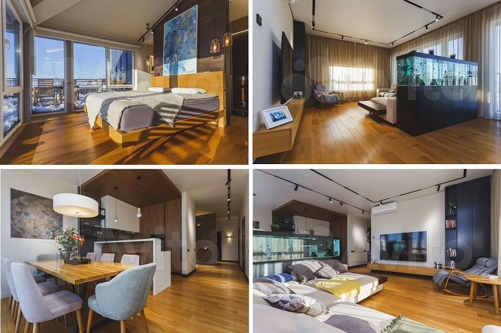 Чем удивляют: Московский дизайнер, работавший над проектом, решил, что обычной стены между комнатами мало, и поставил туда огромный аквариум. Теперь за жизнью рыбок можно наблюдать прямо из кухни-гостиной. И да, здесь есть зона барбекю прямо на террасе — жарить шашлыки с видом на центр города закон не запрещает, если это предусмотрено проектом.