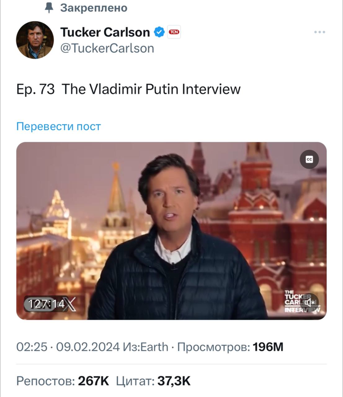 Интервью Такера Карлсона с Путиным, по данным X, просмотрели 196 млн раз. Этот показатель больше, чем у интервью журналиста с премьером Венгрии Орбаном (129 млн просмотров) и кратно выше, чем у интервью с главой Сербии Александром Вучичем (12,3 млн). Но пока что не побит рекорд Хавьера Миллея (у интервью с ним 427 млн просмотров). Не дотягивает интервью с президентом России пока и до просмотров беседы с Трампом (267 млн).