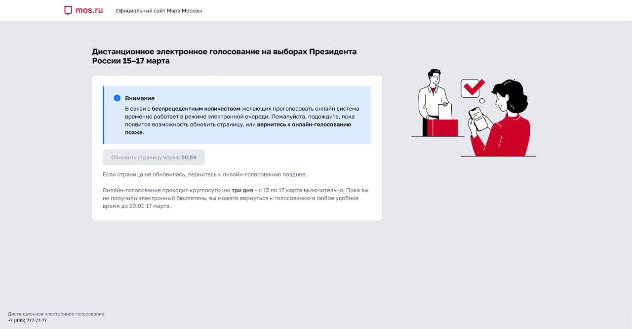 #ДЭГ2024: Систему онлайн-голосования Москвы подготовили к нагрузкам на выборах Президента России✅ Выборы президента страны – событие исключительного значения, которое всегда вызывает повышенный интерес избирателей. Разработчики учли опыт этой избирательной кампании и усовершенствовали систему. 📲 Подробнее рассказал Артём Костырко, начальник Управления по совершенствованию территориального управления и развитию смарт-проектов Правительства Москвы: «Мы ожидаем, что мартовские выборы будут очень популярны среди голосующих, и поэтому предусмотрели в системе онлайн-голосования особый алгоритм. При высоких нагрузках, когда сразу несколько десятков тысяч избирателей зайдут на страницу онлайн-голосования elec.mos.ru, система перейдет в режим электронной очереди. Это позволит обеспечить стабильную работу инфраструктуры электронного голосования и самого mos.ru. Появление такой страницы означает только одно: пользователю нужно подождать или вернуться к голосованию позднее. Это абсолютно нормальное запланированное поведение системы». При переходе системы в данный режим, пользователь увидит специальную страницу. Вот как она будет выглядеть⬆️ Подписывайтесь и узнавайте о новостях Штаба первыми! #ОШ2024 #Выборы2024 #Костырко