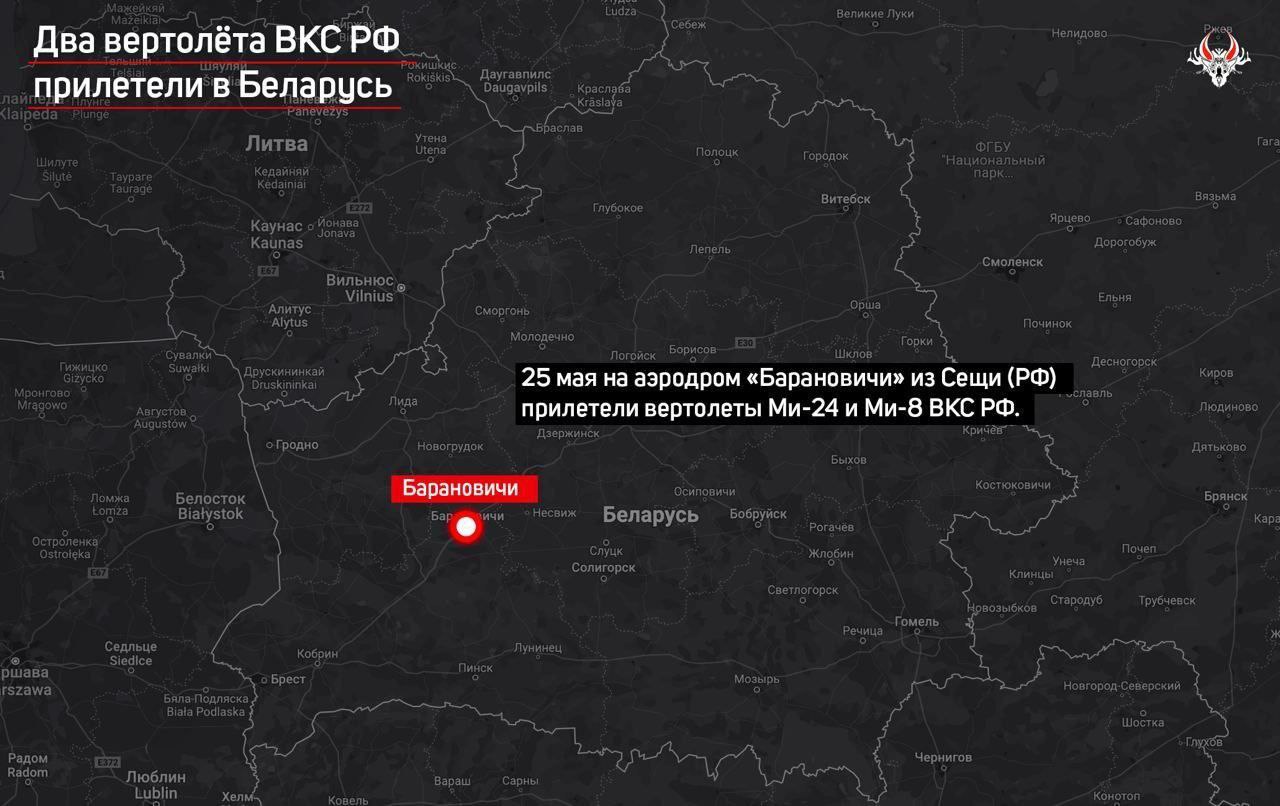 Появляется информация, что на аэродром Барановичи под Минском переброшены ударные вертолёты Ми-24 и Ми-8 ВКС России.