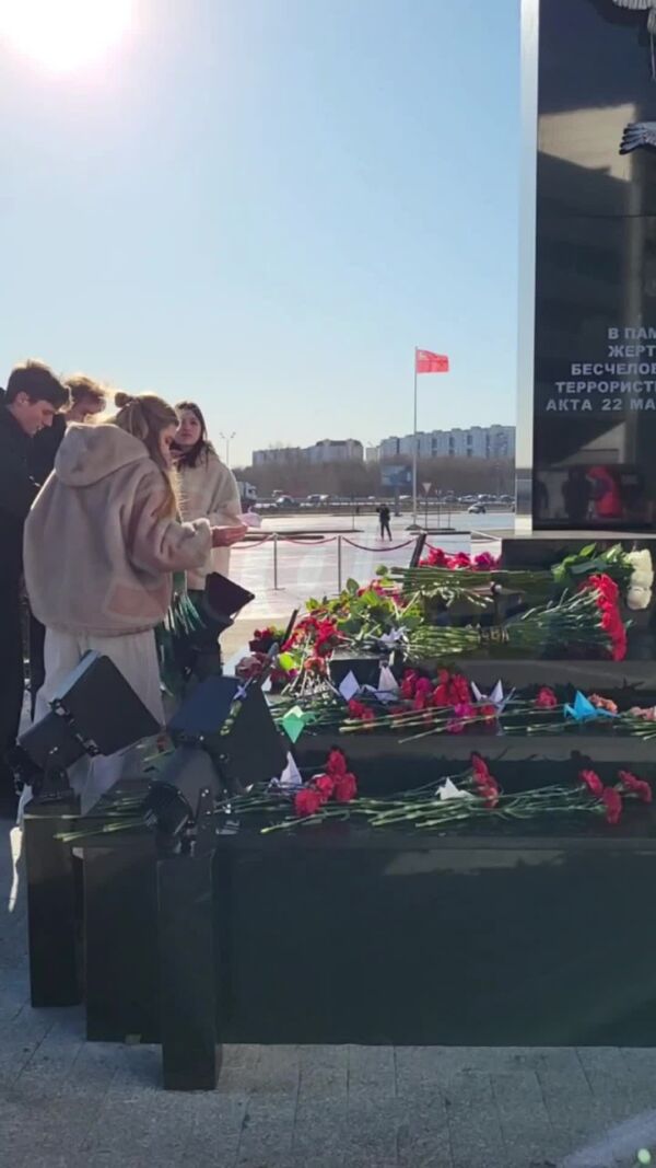 Сегодня в память о тех, кто навсегда остался в «Крокусе», открыли мемориал. Люди с гвоздиками и плакатами в 9:00 собрались у сгоревшего здания.