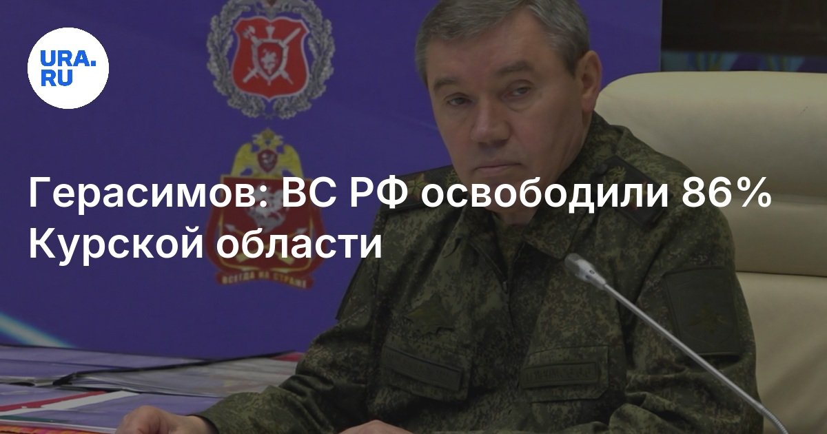 Российские войска освободили 86% территории Курской области, ранее находившейся под контролем Вооруженных сил Украины. Об этом заявил глава Генштаба ВС РФ, первый замминистра обороны Валерий Герасимов.