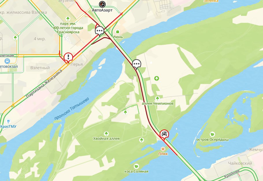 Октябрьский мост встал в огромную пробку. Затор образовался из-за аварии в сторону правого берега. Судя по кадрам очевидцев, столкнулись автобус и грузовик. Они перекрыли часть проезда.
