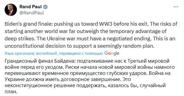 «Грандиозный финал Байдена: подтолкнуть нас к третьей мировой войне перед своим уходом», – возмутился политик и призвал к дипломатическому урегулированию украинского конфликта.