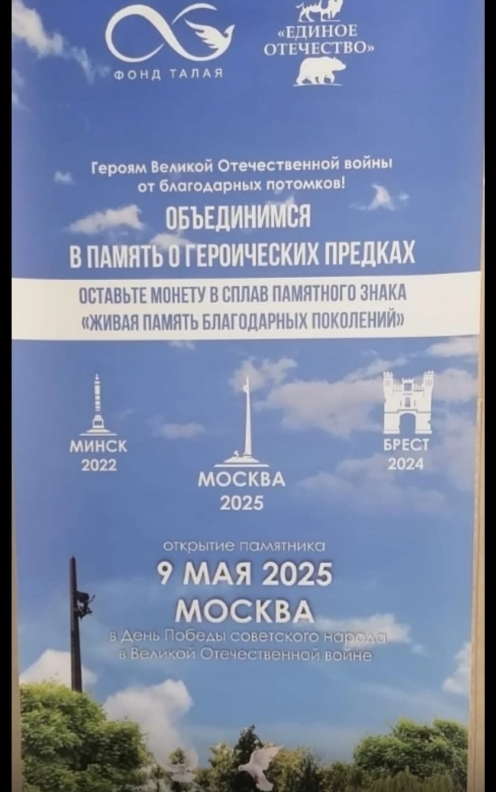 Народный памятник «Живая память благодарных поколений» уже установлен в Минске в 2022 году (в сплаве монеты от 130 000 семей Беларуси и России), изготовлен и будет установлен в Брестской крепости в 2024 году (в сплаве монеты от 500 000 семей Беларуси и России), будет изготовлен весь из бронзы и установлен в Москве на Поклонной горе в 2025 году (в сплаве ожидаются монеты от более 5 000 000 семей Беларуси, России и соотечественников за рубежом).