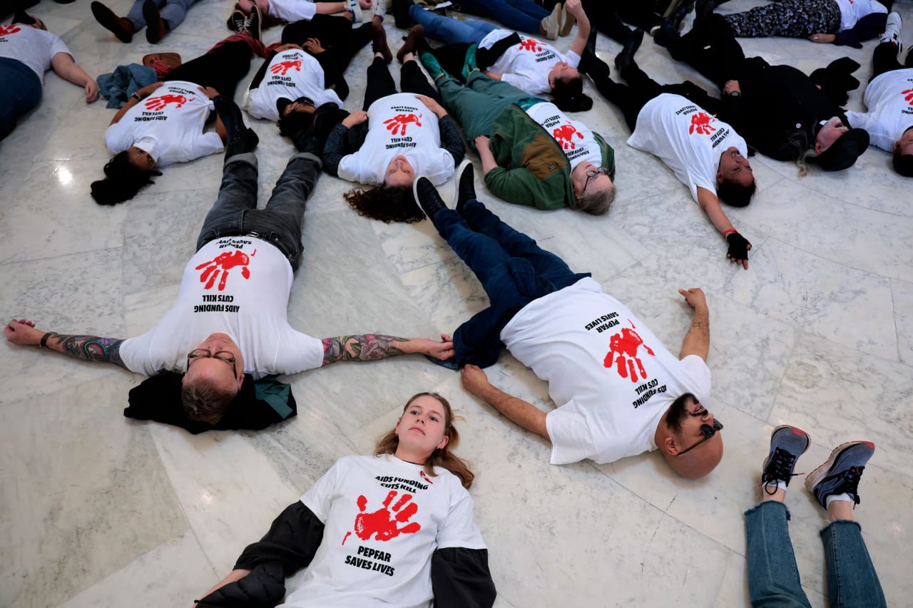 Около трех десятков протестующих в белых футболках с надписью «Сокращение финансирования СПИДа убивает» легли на пол, скандируя: «У Конгресса руки в крови, разморозьте помощь сейчас же».