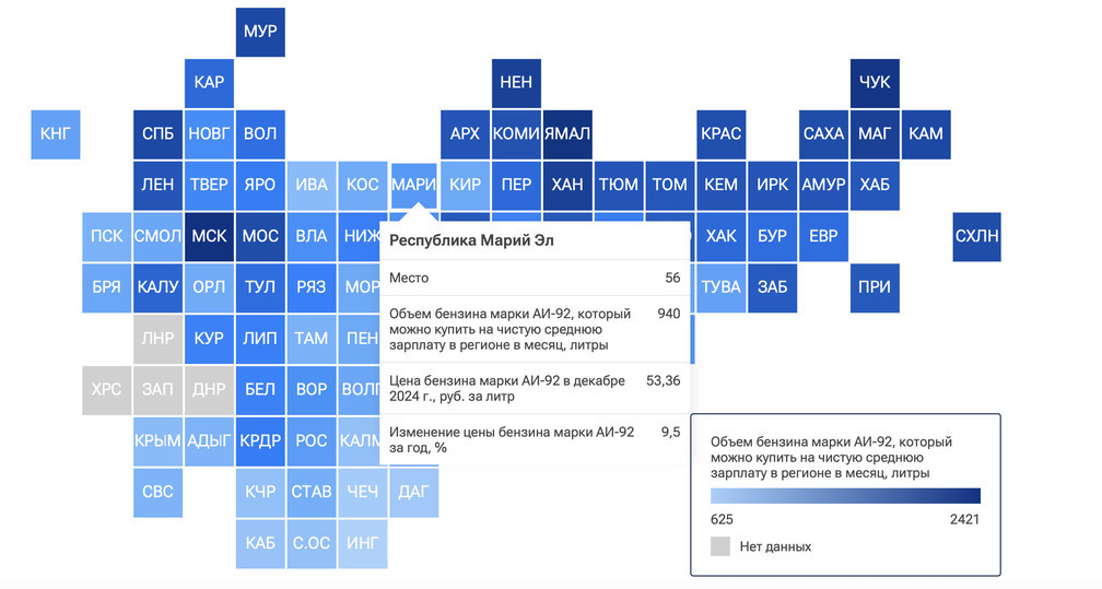 Для расчета доступности топлива учитывалась средняя цена бензина в декабре 2024 года и уровень среднемесячной заработной платы после вычета НДФЛ. В Марий Эл литр бензина стоил 53,36 рубля, что выше, чем, например, в Челябинской области (51,63 рубля), но ниже, чем в Республике Саха (Якутия), где цена достигала 70,12 рубля за литр.