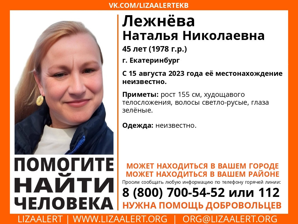 Наталья живет в Екатеринбурге. Информации о ее исчезновении крайне мало: неизвестно ни куда она ушла, ни хотя бы во что была одета. У нее русые волосы и зеленые глаза, худощавое телосложение.
