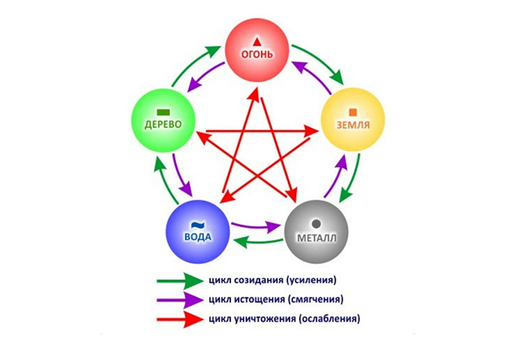 В основе концепции китайского мироздания лежат пять первоэлементов. Они идут в такой последовательности: 木дерево, 火огонь, 土земля, 金металл и 水вода. Эти пять первоосновных элементов мира составляют замкнутый цикл. Дерево порождает огонь. Огонь порождает землю (сгорая, пепел превращается в золу и прах). Земля порождает металл. Металл порождает воду. Меня часто на лекциях спрашивают: «А при чем здесь металл? Как он может породить воду?» Очень просто — есть такой процесс, как конденсация. Ведь вода — это одно из состояний материи, когда воздух, конденсируя, оседает и опускается (практически появляясь из ниоткуда) на более холодной поверхности (в данном случае металла).