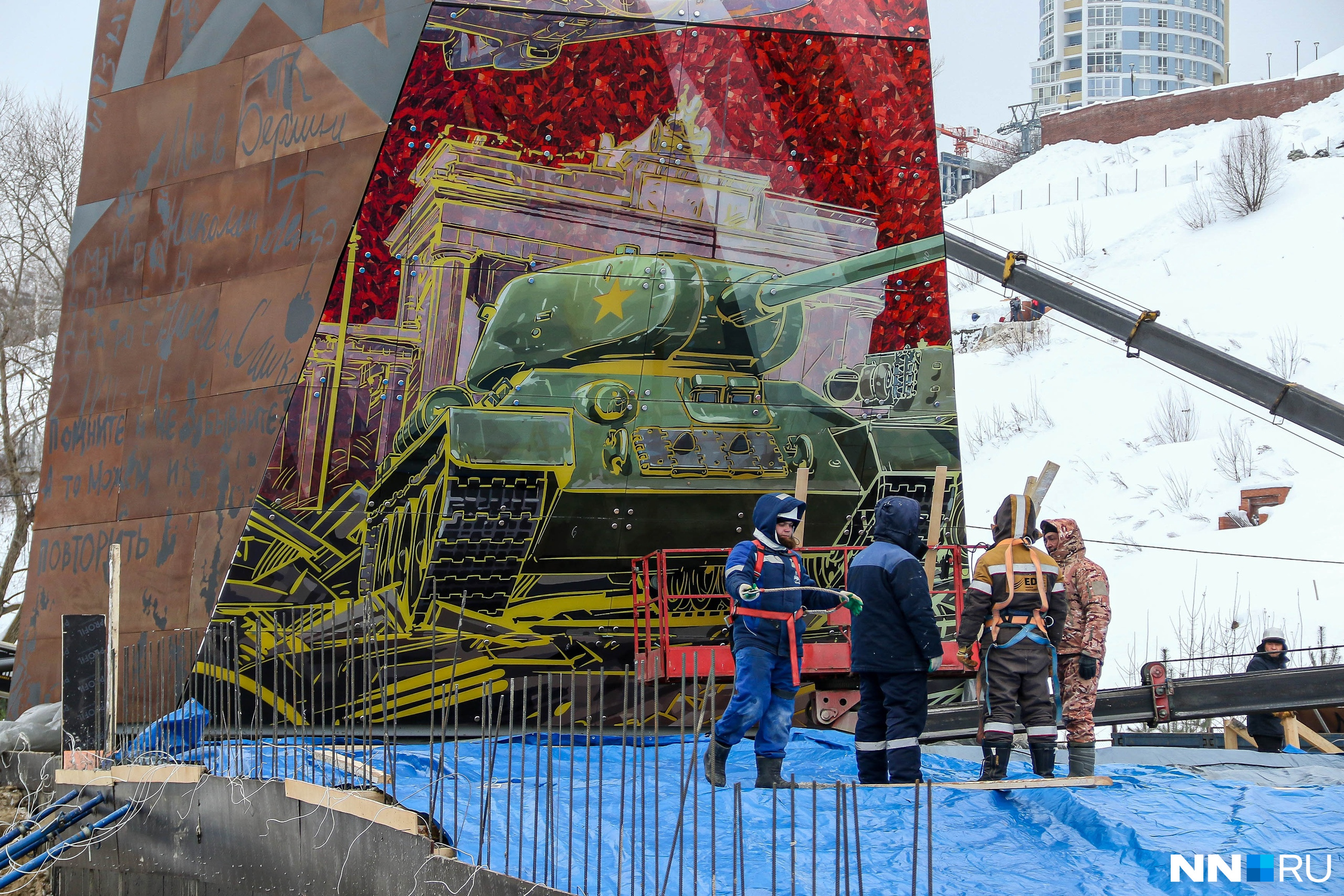 Конструкция представляет собой башню с нанесенными памятными рисунками и надписями. По словам нашего корреспондента, высота сооружения — около 10 метров. Пока монтаж только начался, однако уже можно разглядеть танк на красном фоне.