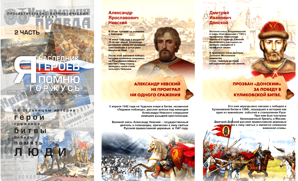 Если фильм первой части проекта рассказывает об исторических фактах Великой Отечественный войны, подвигах наших предков против нацизма, проводит параллели с сегодняшними событиями, то фильм второй части — уже о подвигах великих русских полководцев, начиная с Древней Руси и до наших дней. На экране появляются лица и имена героев, которые на протяжения тысячелетия создавали нашу великую историю, защищая страну от врагов и разорения. И начинается фильм словами великого полководца Александра Невского: «Народ, меняющий героическое прошлое на сытое настоящее, лишает себя будущего». На экране появляются кадры с видами России, её несметными богатствами. Эти богатства добывались нашими предками тяжелыми трудами и ратными подвигами. Всё ради счастья своих детей, внуков, правнуков. Нам очень повезло, что наши предки умели побеждать. Окажись они слабее духом — и могло бы не быть сегодня России.