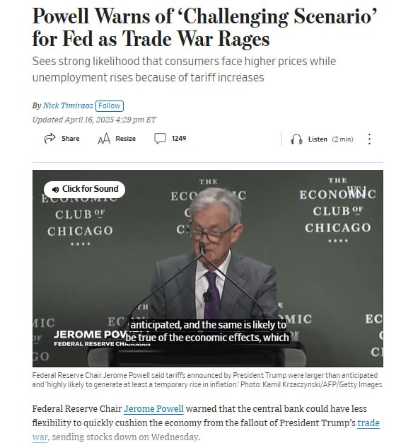🔹Предупреждение главы ФРС Трампу о слишком высоком уровне пошлин