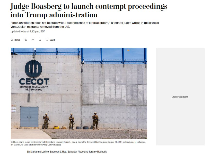 New York Times: Угроза начать разбирательство по делу о неуважении к суду вместе с решением другого федерального судьи начать аналогичное расследование по отдельному делу, связанному с депортацией, стала знаковой попыткой юристов привлечь Белый дом к ответственности.