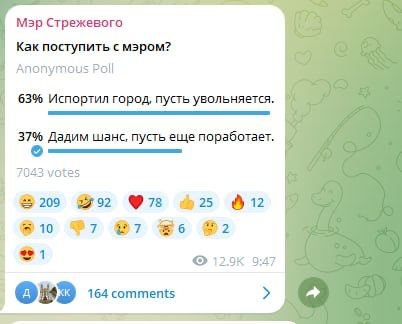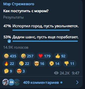 Сначала большинство поддержало мэра, но затем новость разлетелась по сети и в канал к мэру пришли жители других городов — они явно проголосовали против. В какой-то момент 63% «избирателей» выступили за отставку.