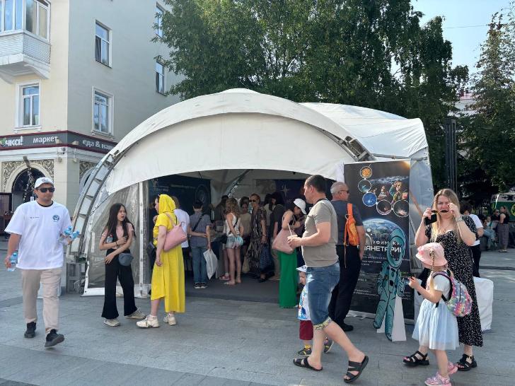 Около следующего шатра столпились люди. Было непонятно, чего они хотят и почему их тут так много. Подойдя ближе, мы заметили вывеску «Уфимский планетарий», и тут все встало на свои места – детей и взрослых интересовала наука и космос! Что еще может быть загадочнее и таинственнее? Юные любители мечтают отправиться навстречу приключениям.