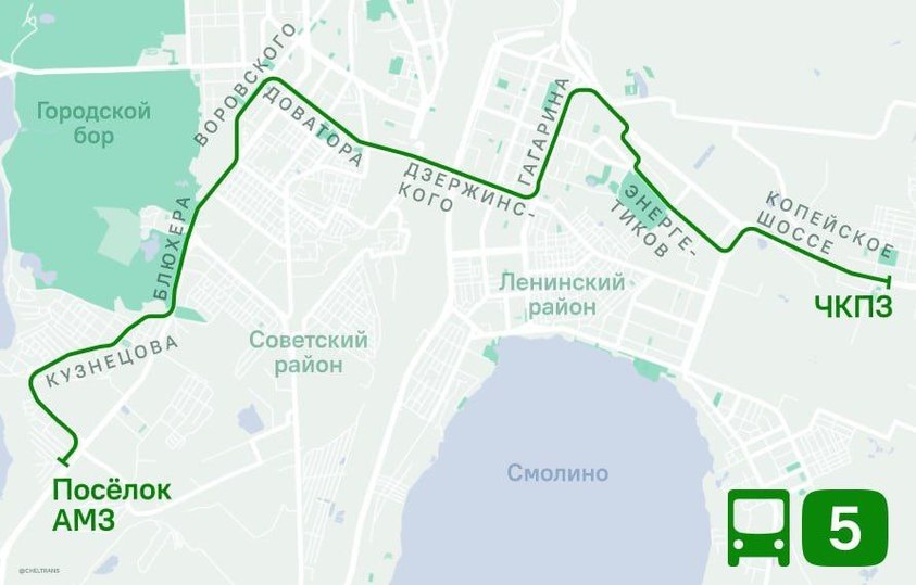 Новый маршрут получил номер 5. По данным телеграм-канала Челябинский общественный транспорт, автобус начинает путь от улицы Весенняя (поселок АМЗ), затем проезжает по улицам Трактовая, Кузнецова, Блюхера, Воровского, Доватора, Дзержинского, Гагарина, Копейское шоссе, Трубников, Энергетиков, Машиностроителей, Копейское шоссе.