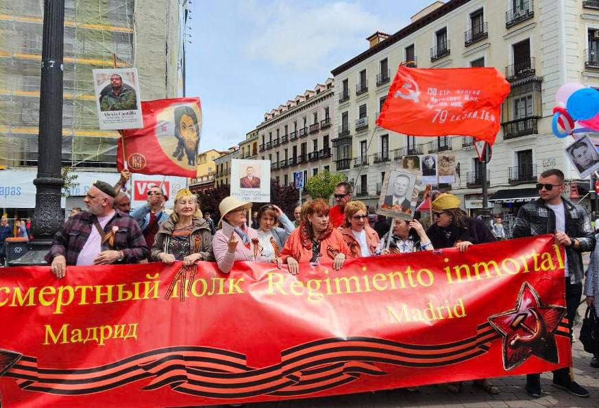Они прошли по улицам столицы Испании с портретами ветеранов ВОВ, со Знаменем Победы и с флагами разных стран.