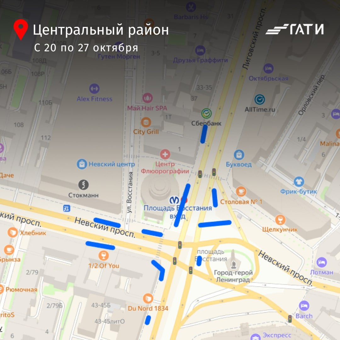 - с 26 по 29 октября — на пересечении Невского проспекта, площади Островского и Малой Садовой улицы;