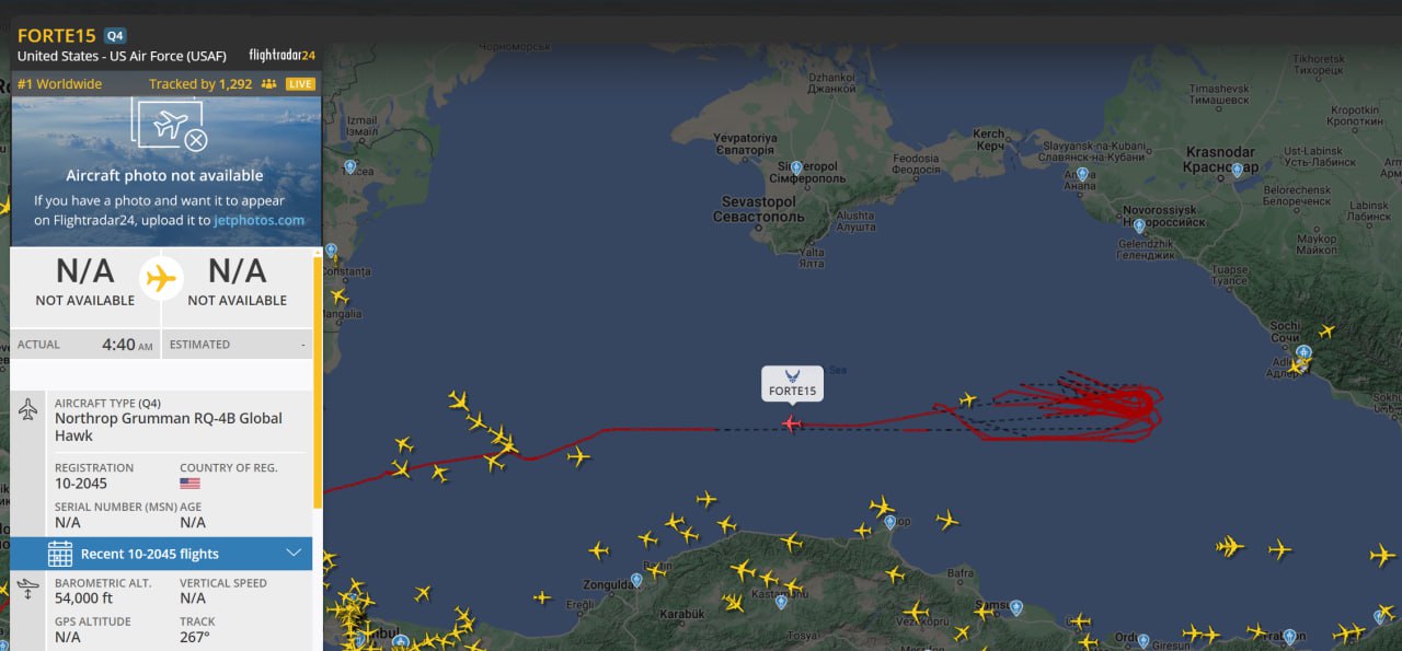 Американский разведывательный БПЛА RQ-4B Global Hawk (на этот раз — с позывным FORTE15) в течение дня очень плотно мониторит ту часть черноморской акватории, которая примыкает к Сочи и Новороссийску. Более 15 кругов.