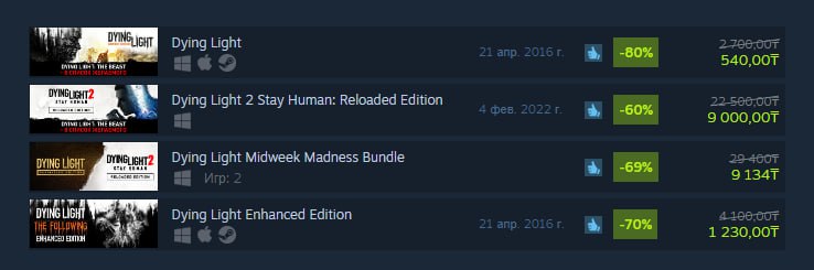 Скидки от 60 до 80%, в зависимости от изданий. Те, кто купит Ultimate версию Dying Light 2 Stay Human получат новую Dying Light: The Beast бесплатно.
