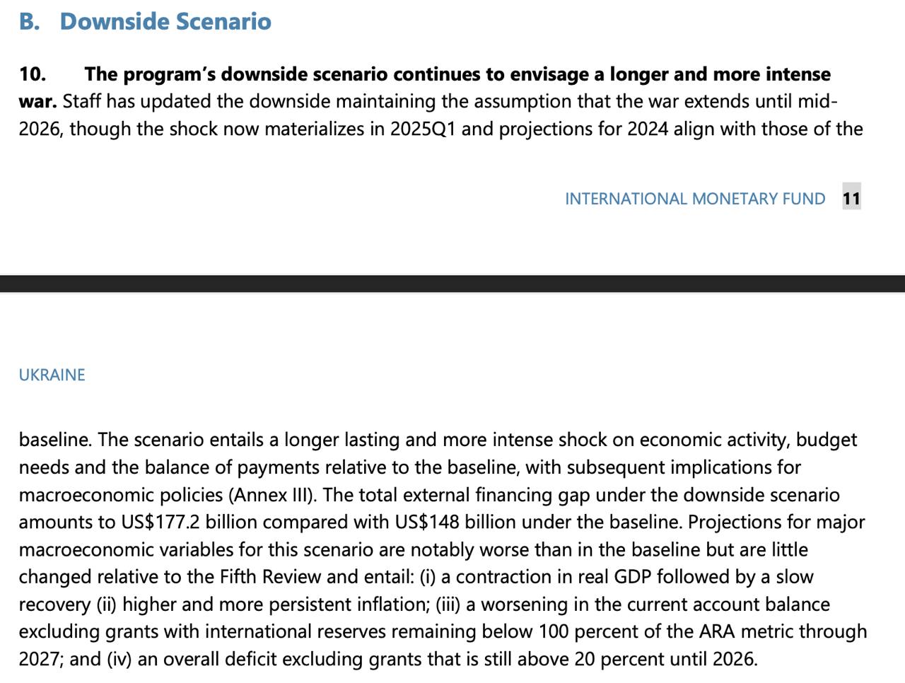 Негативный сценарий "влечет за собой более длительный и более интенсивный шок для экономической активности, бюджетных потребностей и платежного баланса" Украины.