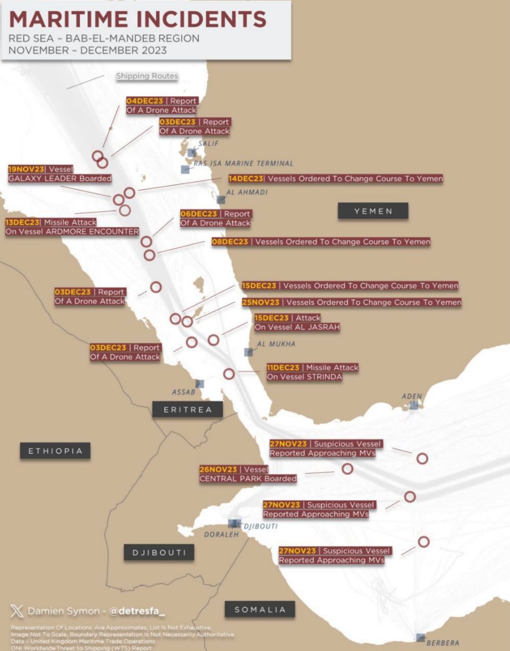 Карта инцидентов в Красном море за ноябрь и декабрь.