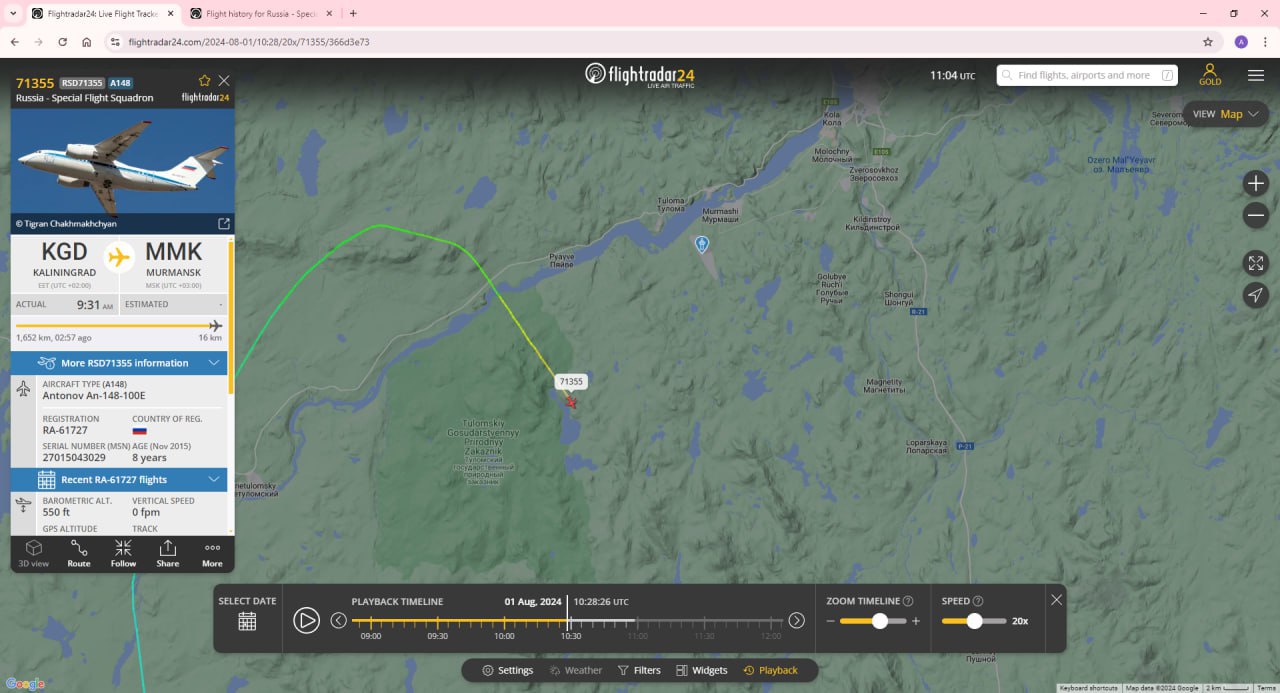 Aн-148 утром вылетел из "Внуково", затем приземлился в Калининграде, а потом долетел до Мурманска. Долгое время рейс был наиболее отслеживаемым на Flightradar, за ним следили более 10 тысяч пользователей.
