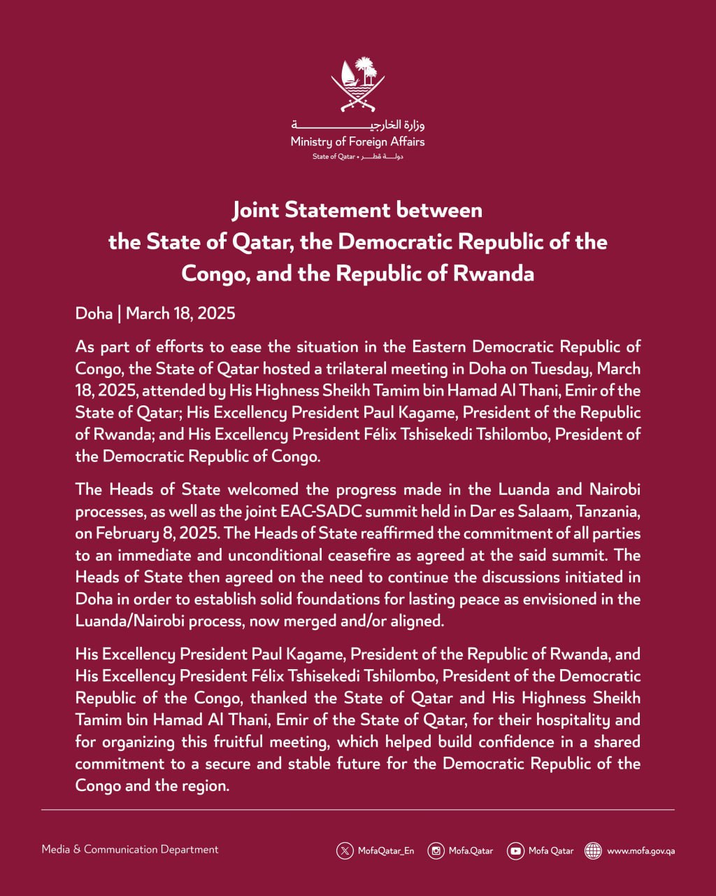 Президент Поль Кагаме и его конголезский коллега Феликс Чисекеди встретились с эмиром Катара шейхом Тамимом бин Хамадом Аль Тани во вторник в Дохе «в рамках усилий по облегчению ситуации» в восточной части Конго, говорится в совместном заявлении трех стран.