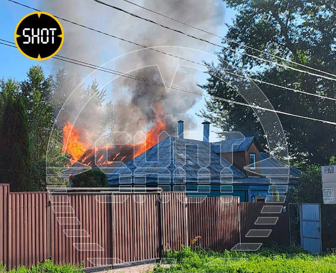 Один из сбитых беспилотников в Новой Москве упал на двухэтажную хозпостройку в деревне Кривошеино. После этого крыша здания загорелась, сообщает телеграм-канал SHOT.