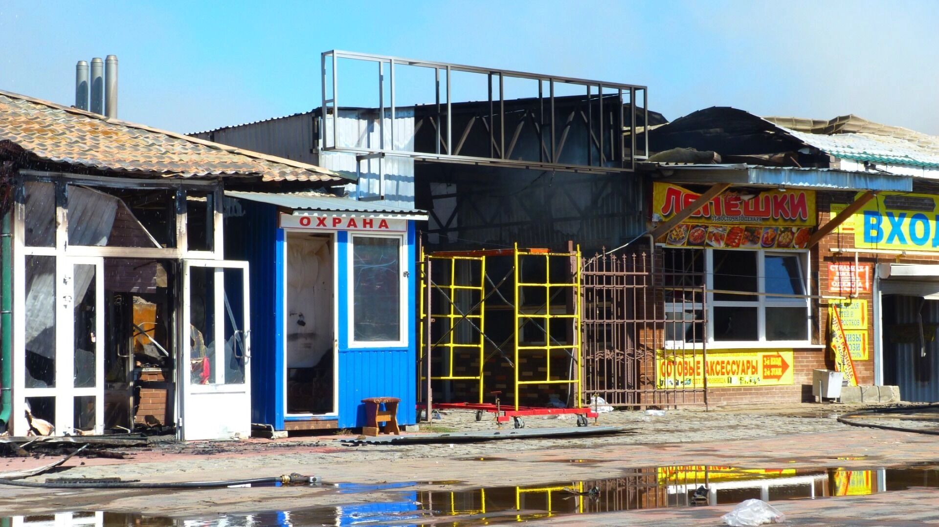 Проходы между павильонами залиты водой, кое-где лежат кучки сгоревшей одежды, превратившейся после огня в лохмотья и грязные тряпки. Кругом также разбросаны коробки и обувь. В одном месте серьезно обвалилась крыша. От прилавков остался один помятый железный каркас.