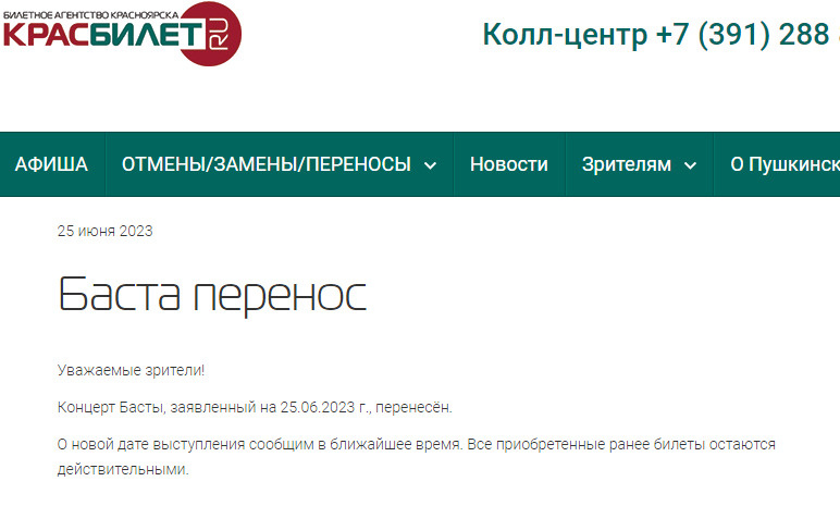 Концерт певца Басты должен был состояться сегодня, 25 июня, в семь вечера на сцене «Платинум Арены». Но меньше чем за сутки до начала концерт отменили. На сайте агентства по продаже билетов «Красбилет» об этом сообщили «день в день». Там обещают, что билеты останутся действительны, но новая дата концерта не известна.