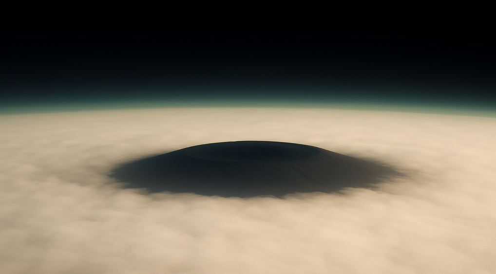На изображении — мягко очерченная темная вершина Арсии, выглядывающая из ярко-белого одеяла облаков. Над горизонтом — тонкая зеленая полоска марсианской атмосферы, а выше — чернота космоса. Это первый раз, когда марсианский вулкан был запечатлен именно с такой перспективы — на фоне планетного горизонта, аналогично тому, как астронавты с МКС видят Землю.